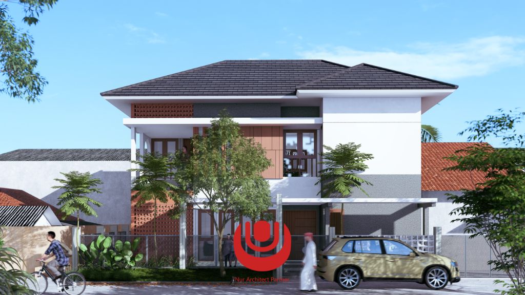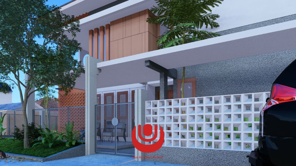 Penggunaan bata trapezium pada fasad memiliki tujuan antara lain sebagai elemen Estetika (emphasize) serta mengalirkan Udara alami dari luar menuju ruang mushola dengan tidak mengabaikan privasi visual dari arah luar ke dalam. Kesedehanaan bentuk bentuk geometris Persegi, Segitiga, Lingkara, Trapesium dan Garis terpadu apik dalam fasad bangunan. Finishing material pada pagar dipilih transparan agar tetap menampilkan desain Fasad dengan tetap mempertimbangkan aspek keamanan. Penggunaan komposisi asimetris dimaksudkan untuk menyeimbangkan bentuk serta warna yang dipilih dalam desain.